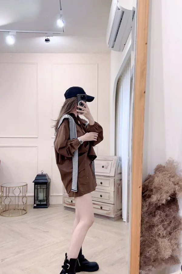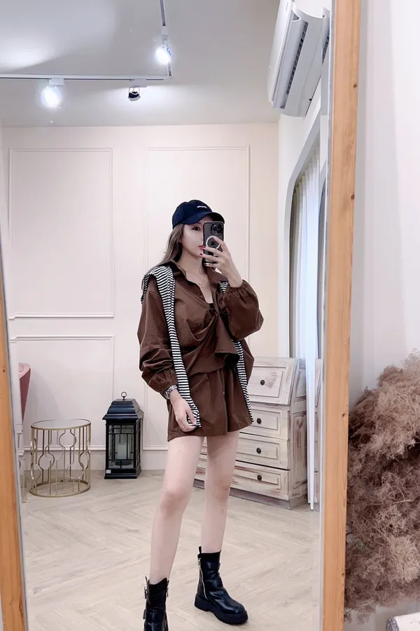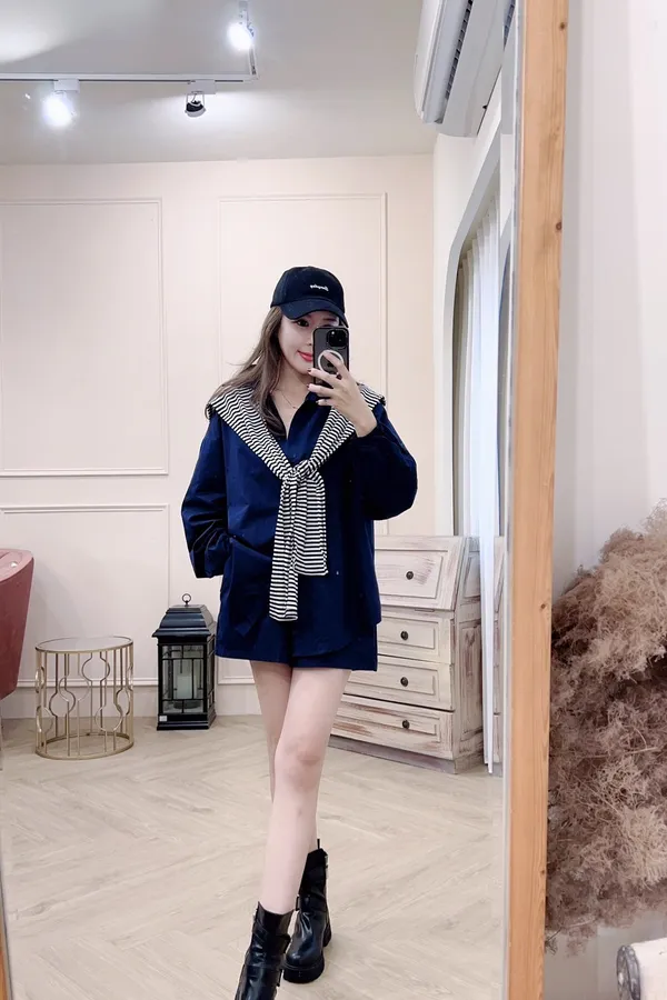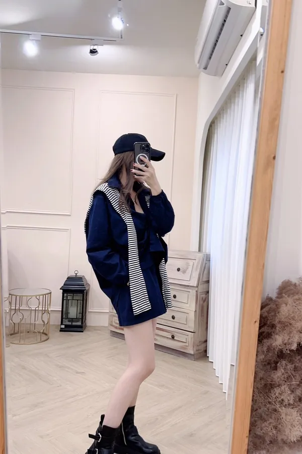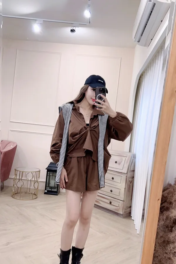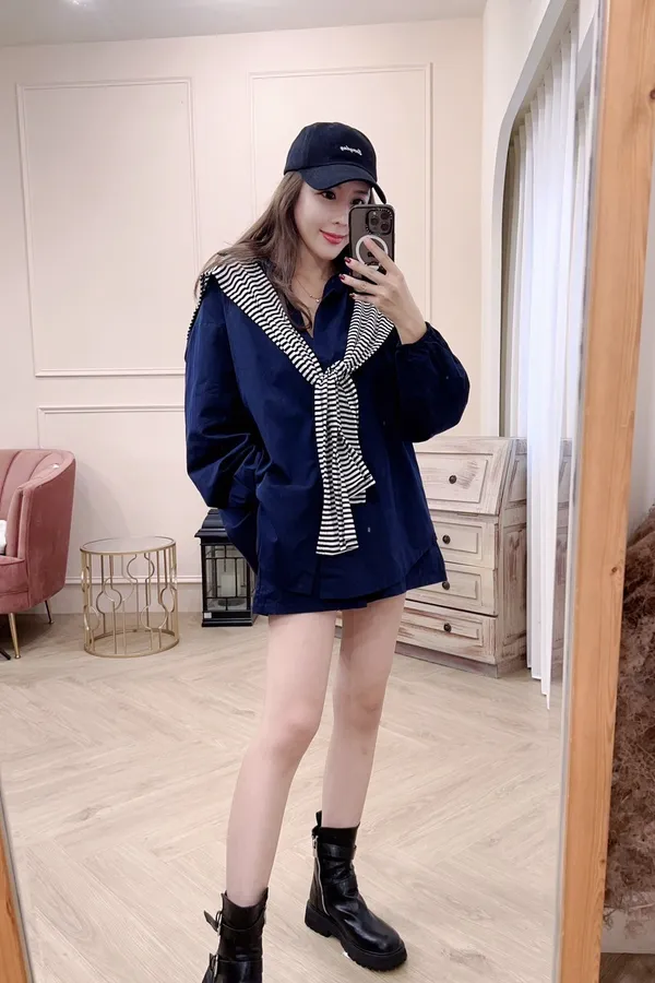 三件式條紋披肩襯衫+鬆緊短褲套裝