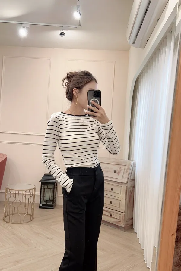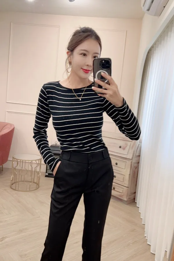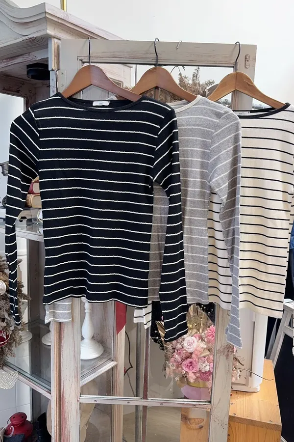 605螺紋彈性圓領條紋上衣