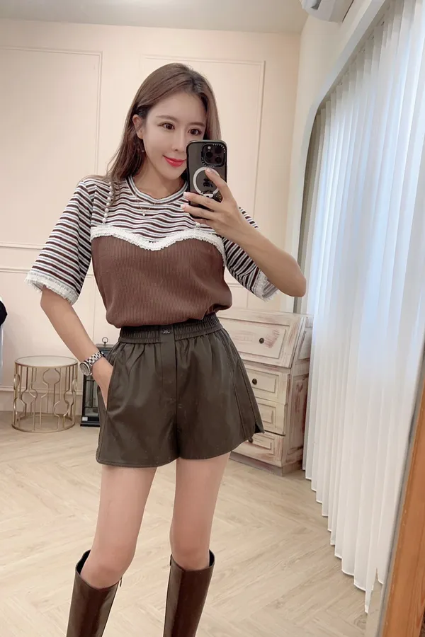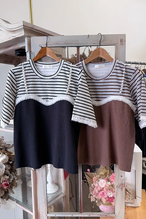 623珍珠肩帶造型條紋配色棉T上衣