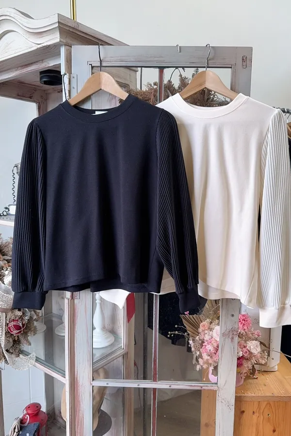 壓褶造型袖圓領棉上衣