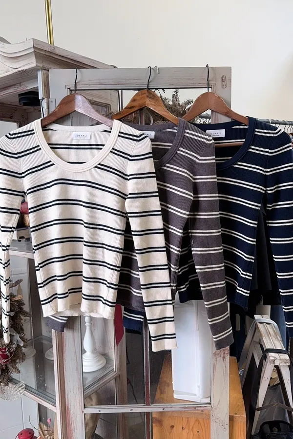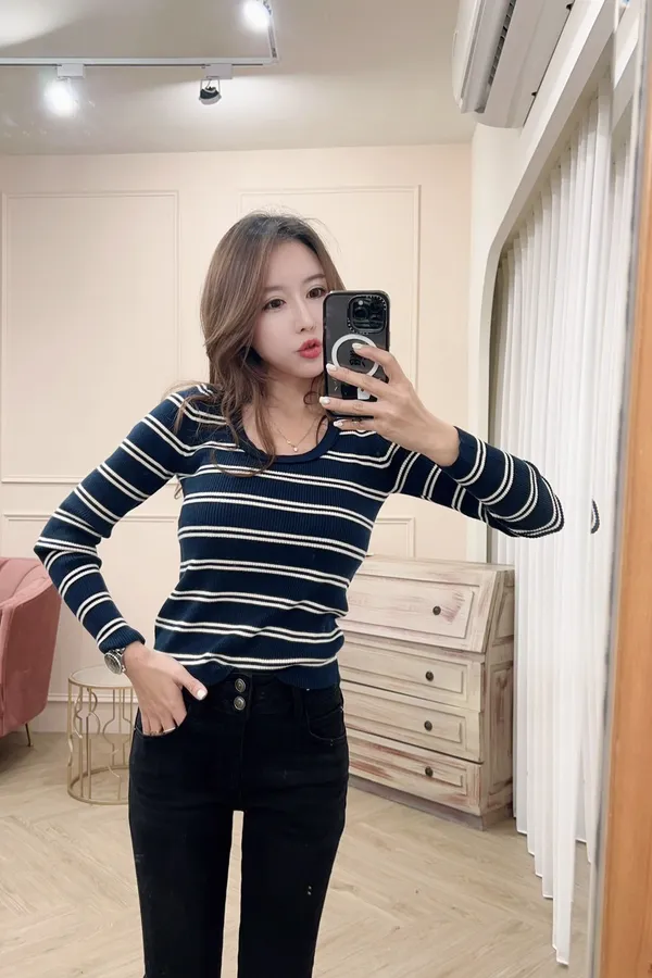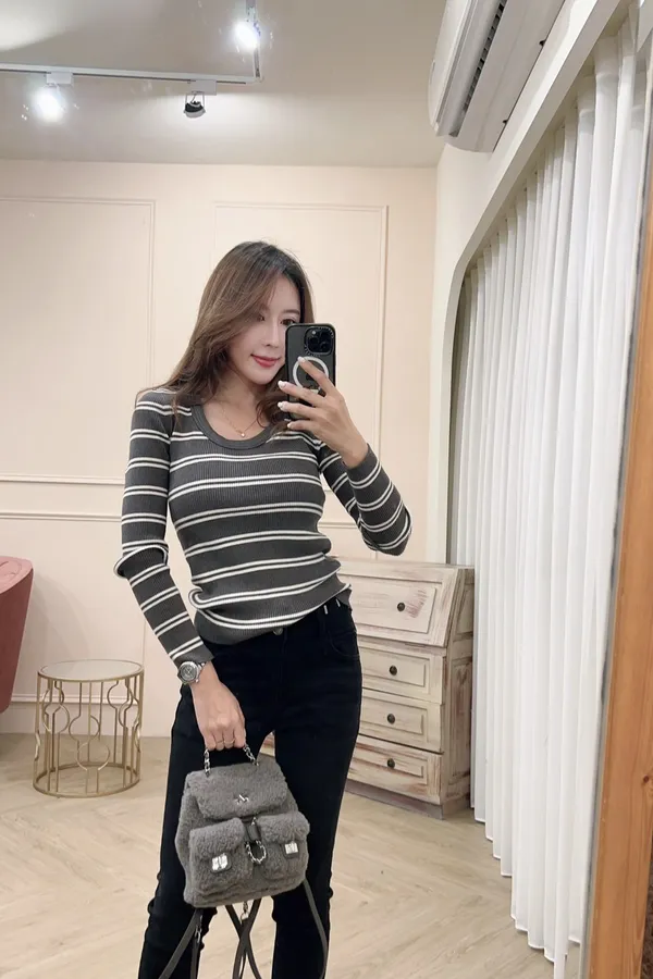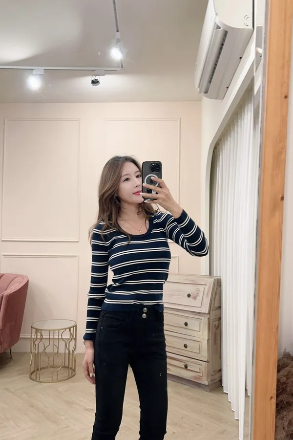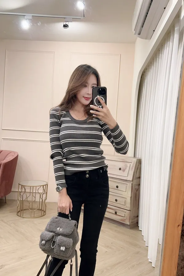 115圓領條紋彈性針織上衣