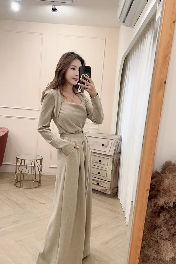 方領兩件式刷毛寬褲套裝