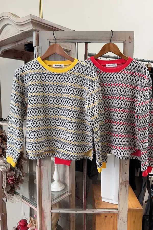 307圓領配色菱格圖案棉質上衣