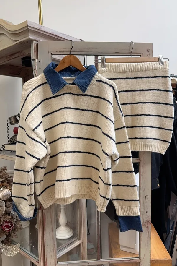 327牛仔拼接條紋針織套裝(上衣+裙子)