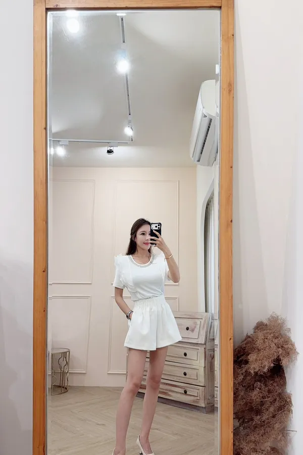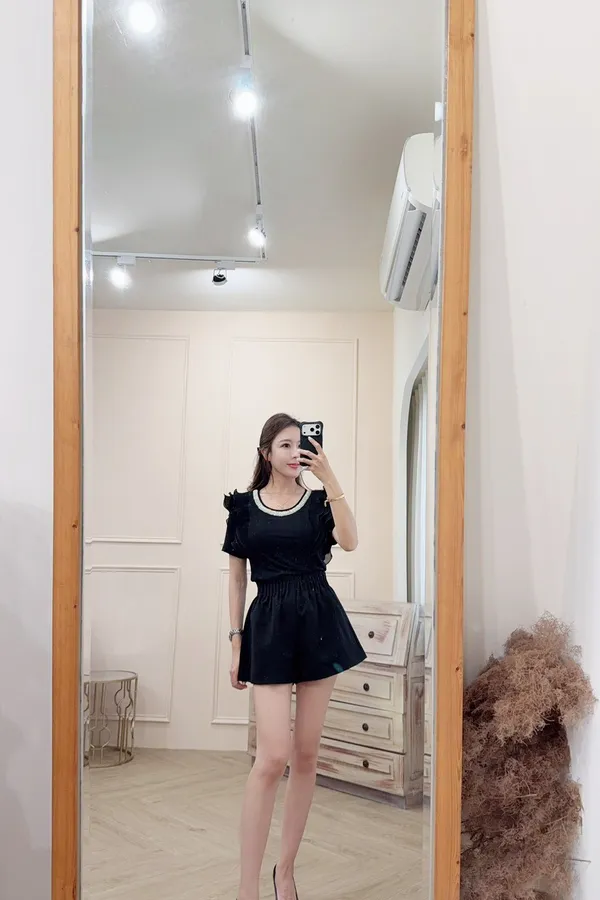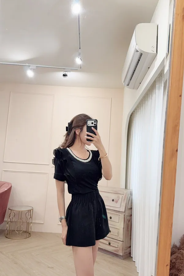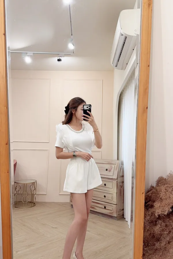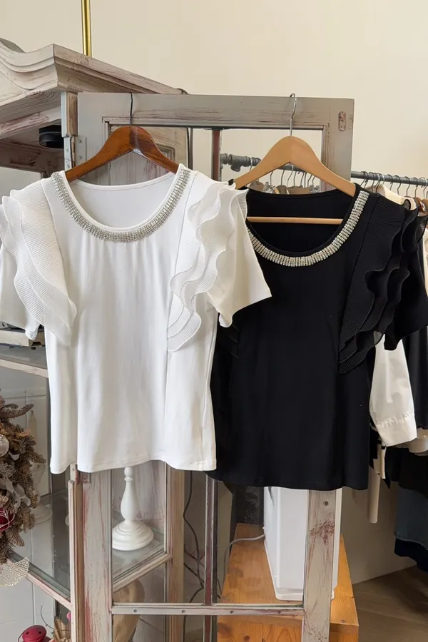 218鑽領荷葉肩造型彈性棉上衣